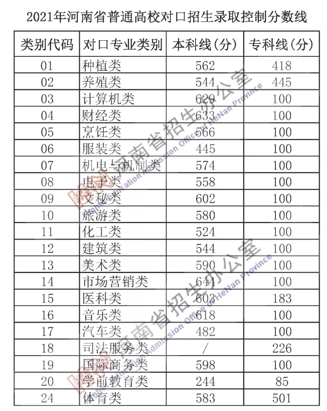 2021年河南省普通高校对口招生录取控制分数线