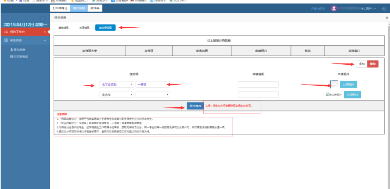 如有加分证书,需要加分,必须在规定时间按照要求上传电子版信息,进入工作台后,点击左上角显示“加分项信息”,然后点击下拉键选择证书性质,后选择奖项级别,然后点击右侧“上传图片”上传对应的证书,如有多个证书,点击“添加”,重复以上步骤,最后点击下方“保存修改”即可。详情见图10。
