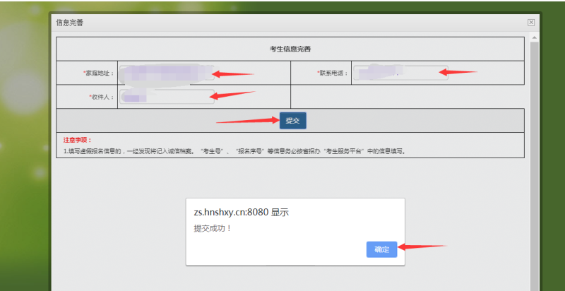 信息如实填写完毕后点击“提交”,之后会弹出提交成功窗口,需要再次点击弹窗中“确定”。详情见图3: