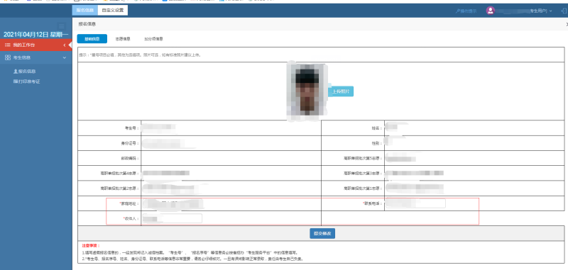点击“报考信息”,在右侧会显示考生详细信息,标*号部分可再次检查修改,其余部分不可修改。修改之后点击“确认修改”。详情见图9。
