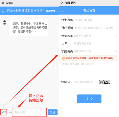 3.在对话框输入问题,系统可自动识别常见问题关键词并给予智能回复;超出系统常见题目范围的问题,可点击“留言”,准确填写相关信息,由工作人员解答后直接发送至所留邮箱。(图8)